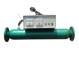 電子式水處理器是利用電子元器件產生的高頻交變電磁場,讓水在經過水處理器時,物理性能發生改變。由原來易吸咐在容器表面的斜方晶系晶體,變成不易吸附的三斜晶系的針裝晶體,從而在管壁上無法結垢,達到防垢的目的。由于水分子在磁場、電場的作用下減弱了垢鹽離子的結合,使垢鹽離子形成開垢表面,成為水合離子進入水中,使受熱爐壁、管壁上原來的水垢逐漸軟化、疏松、自行脫落,起到除垢的作用。水中的細菌、藻類細胞因高頻電磁場、電場的作用,使細胞內原生質產生電離,影響細胞的正常代謝,導致菌藻死亡,起到殺菌、滅藻的作用。